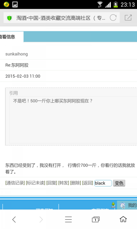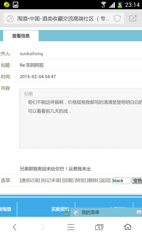 尊敬的梦版,你好,我两次申请强制放款你不同意,说我欺骗网站,那我把此次交易的全部过程在这详尽的交代清楚。我与买家sunkaihong于2月1号交易了4盒250克装东阿阿胶,帖子上标明是250克装,500一盒,他于当天确认,并打款社区中介,我亦于当天发了顺丰,单号321033140207。第二天,货还在途中,就给我发信息说看错价格了。收到货后让我给他便宜,我不同意并提出嫌贵我给你退货,可是当我提到退货后,他就再没消息了,也不说退货,也不放款。我也没当回事,觉得等他收到货超过7日后我可以申请强制放款,但是你说这属于有争议,不能申请强制放款,并说我欺骗网站。我刚到淘酒,不懂淘酒规则,可是我想给你大声说,我没有任何想欺骗网站的意思!下面我把我和买家sunkaihong的交易记录传上来。